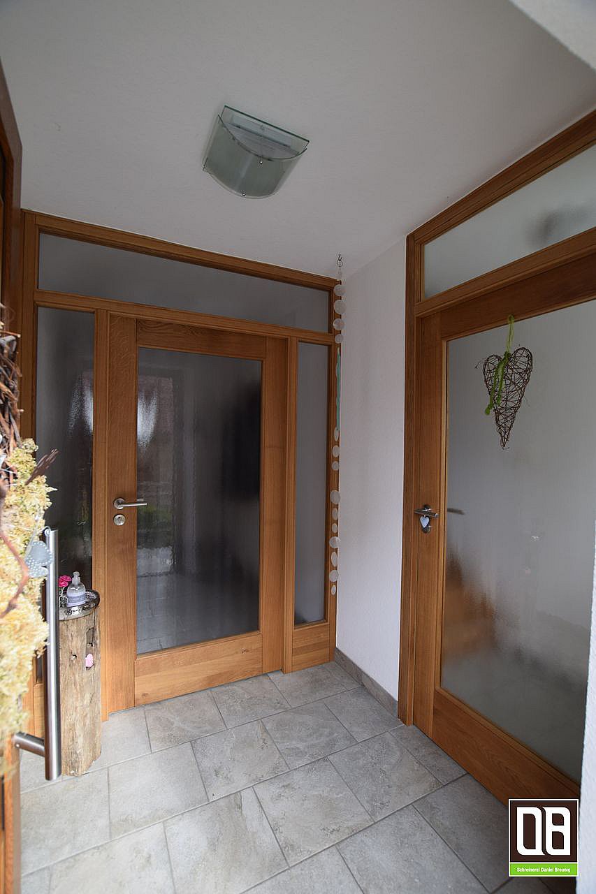 Abtrennung von einem offenen Eingangsbereich durch Trockenbauwand von Erdgeschoss bis Dachgeschoss. Fertigung und Montage der eingestemmten Eiche-Treppe sowie der in massiver Rahmenbauweise gefertigten Wohnungseingangstüren. Lieferung und Montage der Aluminiumhaustüre