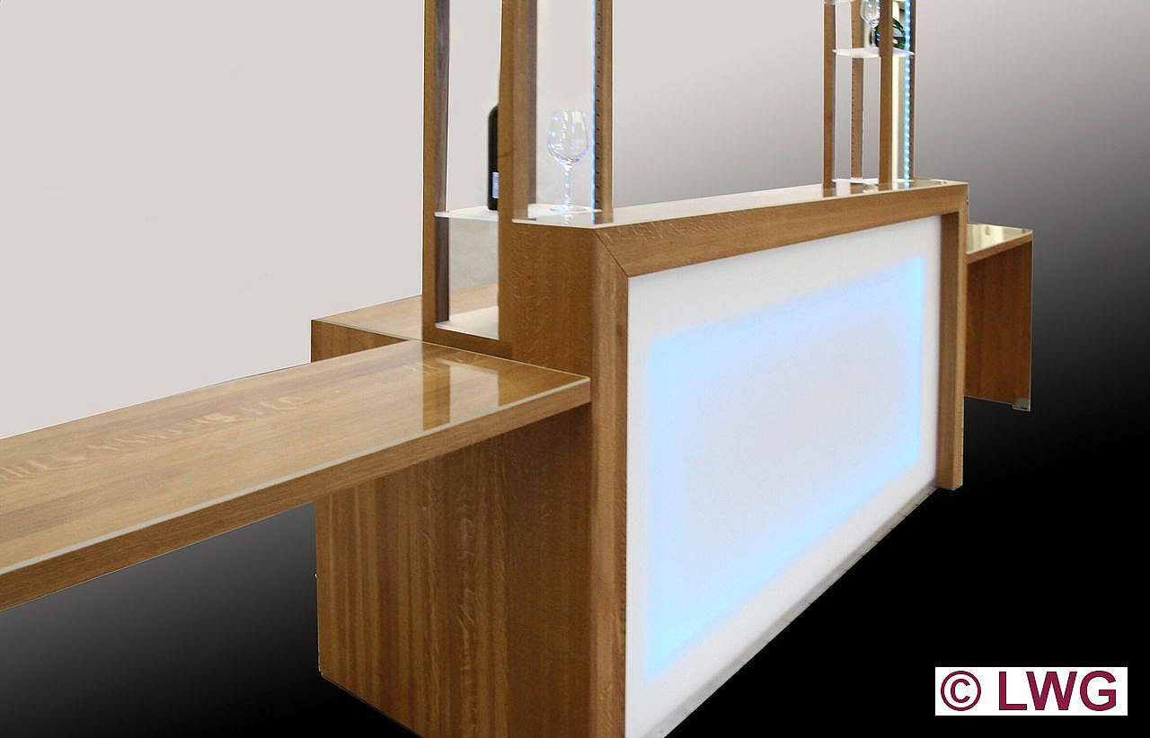 In den offenen Vitrinen werden Bocksbeutel und Co dargestellt, gleichzeitig tragen diese aber auch den Überbau der Theke in dem die Weingläser durch integrierte LED-Beleuchtung ein schillerndes Lichtspiel ergeben.